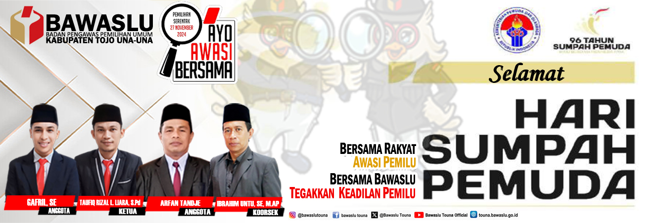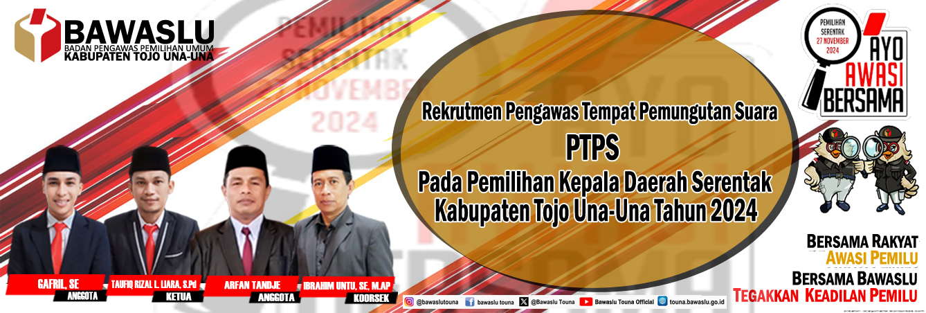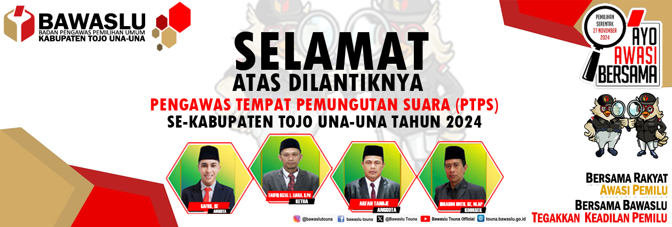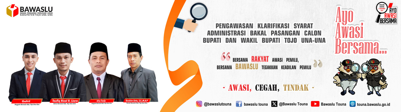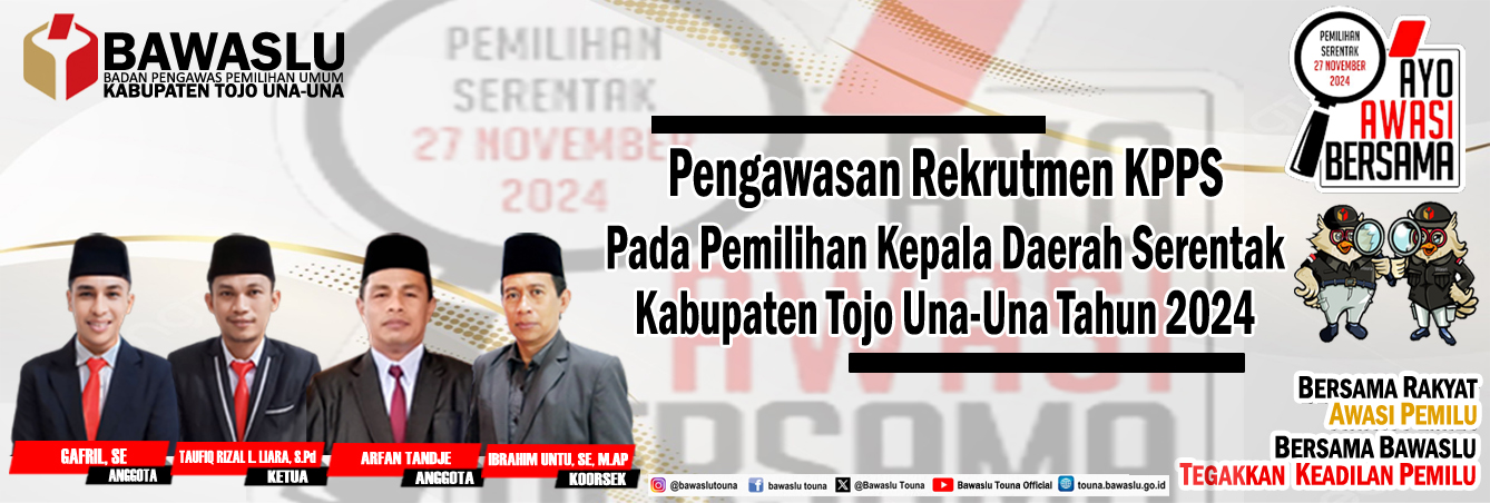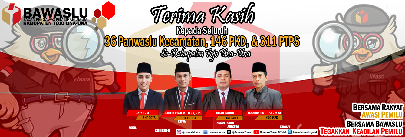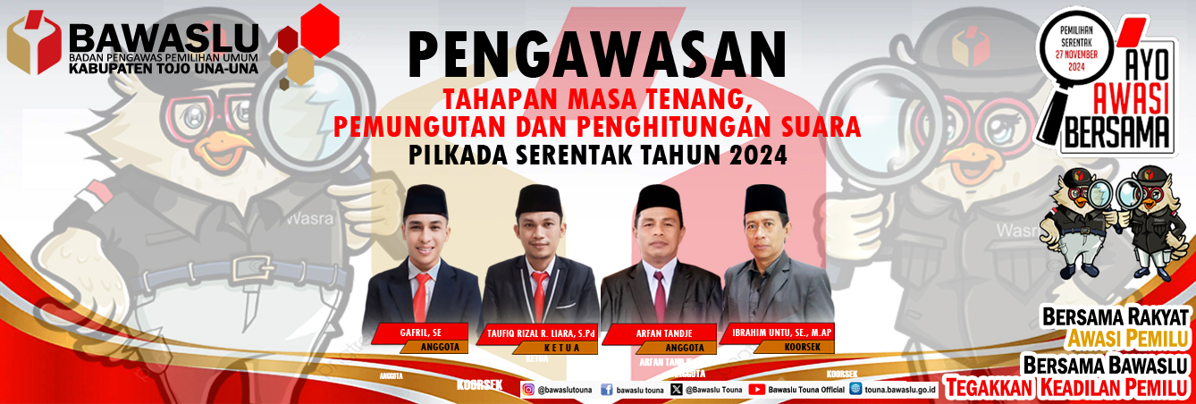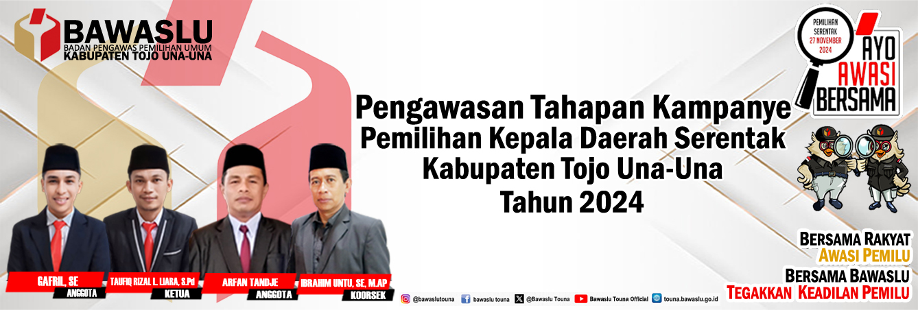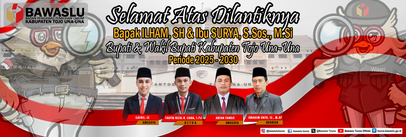 Pengumuman Pengumuman Rekruitmen Tenaga Pendukung Bawaslu Kabupaten Tojo Una-Una Lihat Selengkapnya Lapor Pelanggaran Pemilu Hasil Pengawasan Tahapan Pemilu 2024 Ajukan Permohonan Sengketa Proses Pemilu Bagaimana Cara Ikut Awasi Pemilu Lapor Hoaks Pemilu Apa Saja Yang Diawasi Pada Tahapan Pemilu Berita RDK Di Bawaslu Touna, Kabag Adm : Lembaga ini dikemas menjadi satu lembaga besar humas Selasa, Desember 16, 2025 - 18:27 Hadiri Pleno PDPB Triwulan IV Di KPU, Bawaslu Touna Beri Saran Perbaikan humas Senin, Desember 8, 2025 - 20:06 RDK Bawaslu Touna, Bahas Peningkatan Layanan Administrasi Dan Fungsi Kesekretariatan humas Jumat, November 21, 2025 - 21:52 Bawaslu Touna Gelar RDK Peningkatan Layanan Hukum Melalui Pengelolaan JDIH Bawaslu humas Kamis, November 20, 2025 - 19:31 Tingkatkan Fungsi Jajaran Pengawas, Bawaslu Gelar RDK Secara Intens humas Senin, November 17, 2025 - 16:43 https://sigaplapor.bawaslu.go.id/ https://ppid-touna.bawaslu.go.id https://sips.bawaslu.go.id/ https://google.com https://jdih.bawaslu.go.id/ Galeri Apel Siaga Pengawasan Pilkada Serentak Tahun 2024 Pencarian Saran dan Pengaduan Saran dan pengaduan dengan untuk kemajuan Bawaslu Ajukan