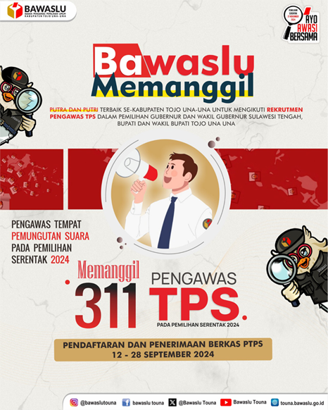 Ampana, Bawaslu Touna - Badan Pengawas Pemilu (Bawaslu) Kabupaten Tojo Una-Una, akan segera membuka rekrutmen Pengawas Tempat Pemungutan Suara (PTPS) Pemilihan Kepala Daerah (Pilkada) Serentak Tahun 2024. Pendaftaran dan penerimaan berkas akan dibuka mulai tanggal 12 sampai dengan tanggal 28 September 2024, yang akan dilaksanakan secara serentak di Kantor Panwaslu Kecamatan se-Kabupaten Tojo Una-Una. Jumlah Tempat Pemungutan Suara (TPS) di Kabupaten Kabupaten Tojo Una-Una, di wilayah daratan dan kepulauan sebanyak 311 TPS.